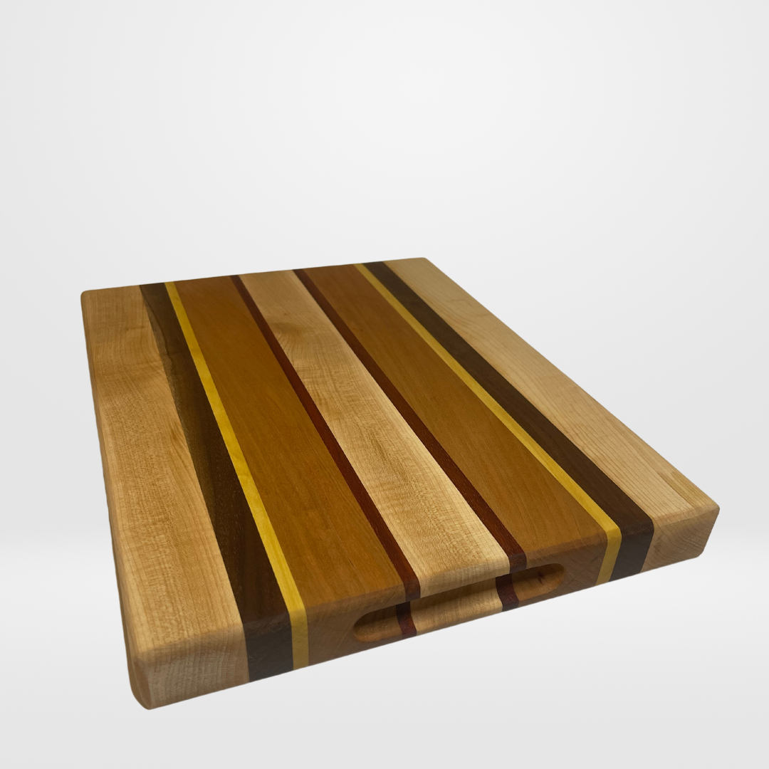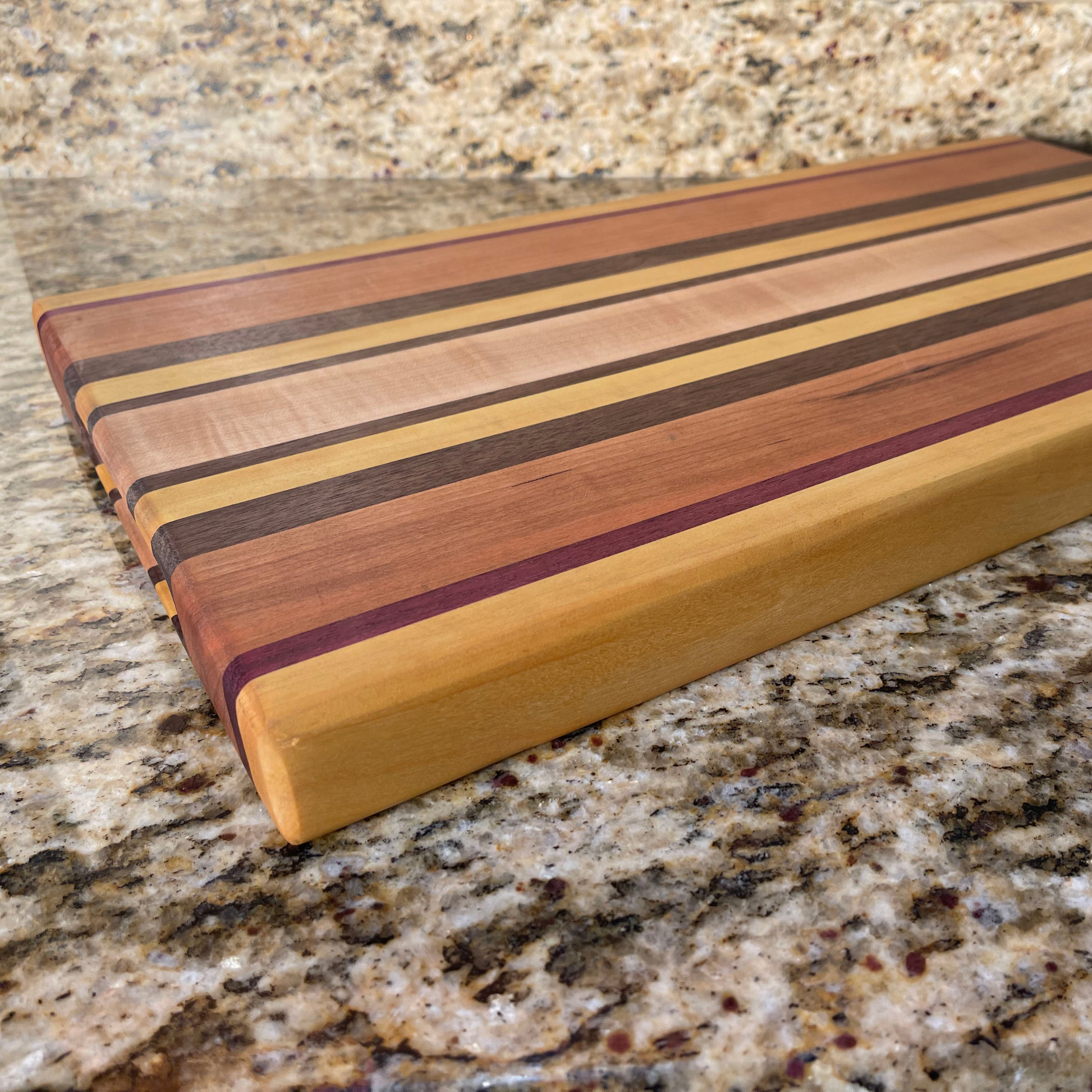 This is a handmade, edge grained cutting board with zero dyes or stains. This cutting board is part of our Passport Series. It is made from 1 ½” thick Cherry, Maple, Purple Heart, Walnut, and Yellow Heart. This is a cutting board that is stunning enough to be used as a charcuterie board or for food display. The board comes standard with rounded edges and handles routed on both long ends. Both sides can be used as a cutting surface. It has a food safe finish that will ensure long usage. Occasional maintenance with cutting board or butcher block conditioners (oils, wax, butters, blends, etc.) are recommended. Our own blend of food safe conditioner is included with the purchase of the board. Washing and care instructions also included.