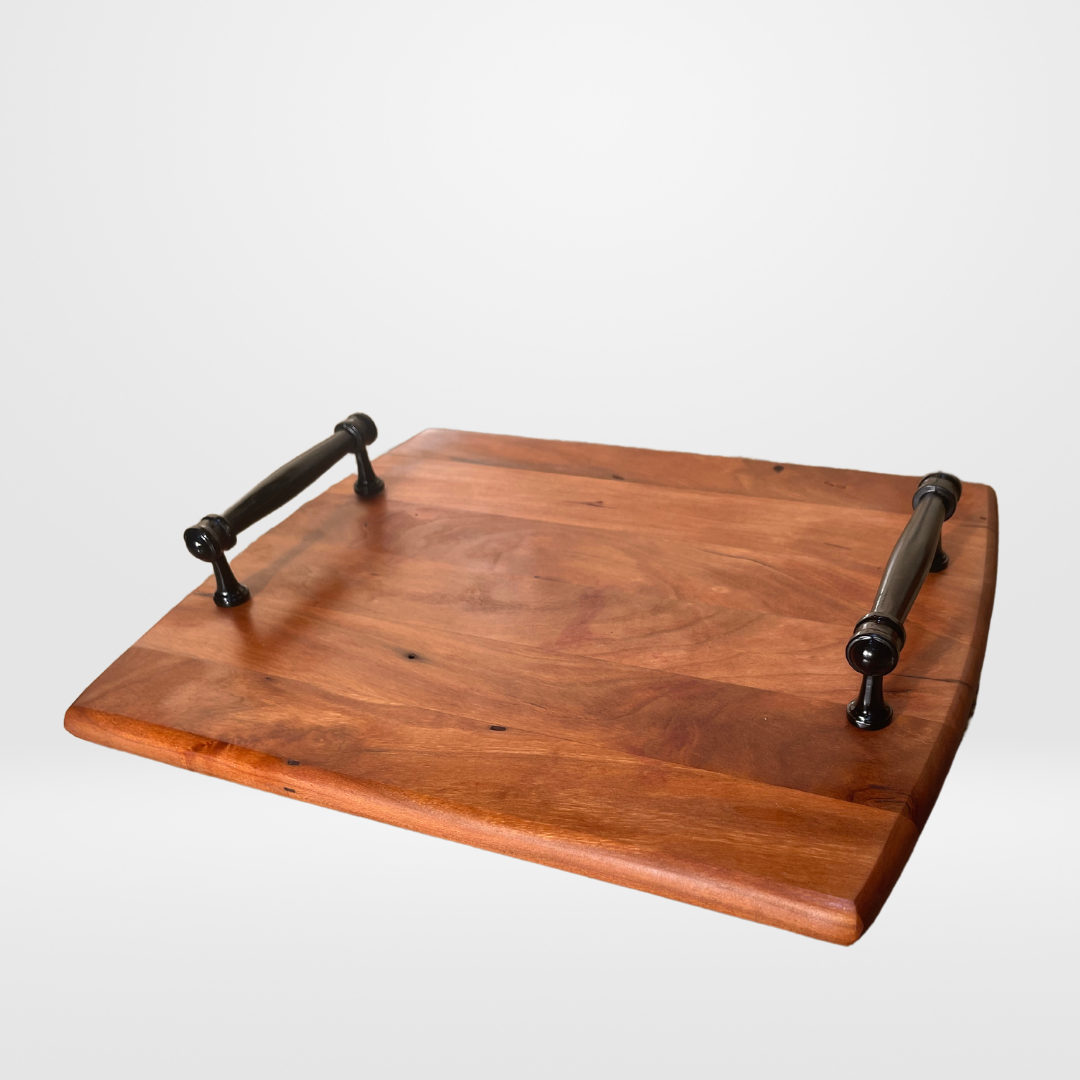 This hardwood charcuterie board is a handmade, face grained, board made with zero dyes or stains. It is made from ¾” thick Cherry from the Eastern US and comes with handles. This board would work great for charcuterie, food display, breakfast in bed, and so much more. It has a food safe finish that will ensure long usage. Occasional maintenance with cutting board or butcher block conditioners (oils, wax, butters, blends, etc.) are recommended. Washing and care instructions also included.