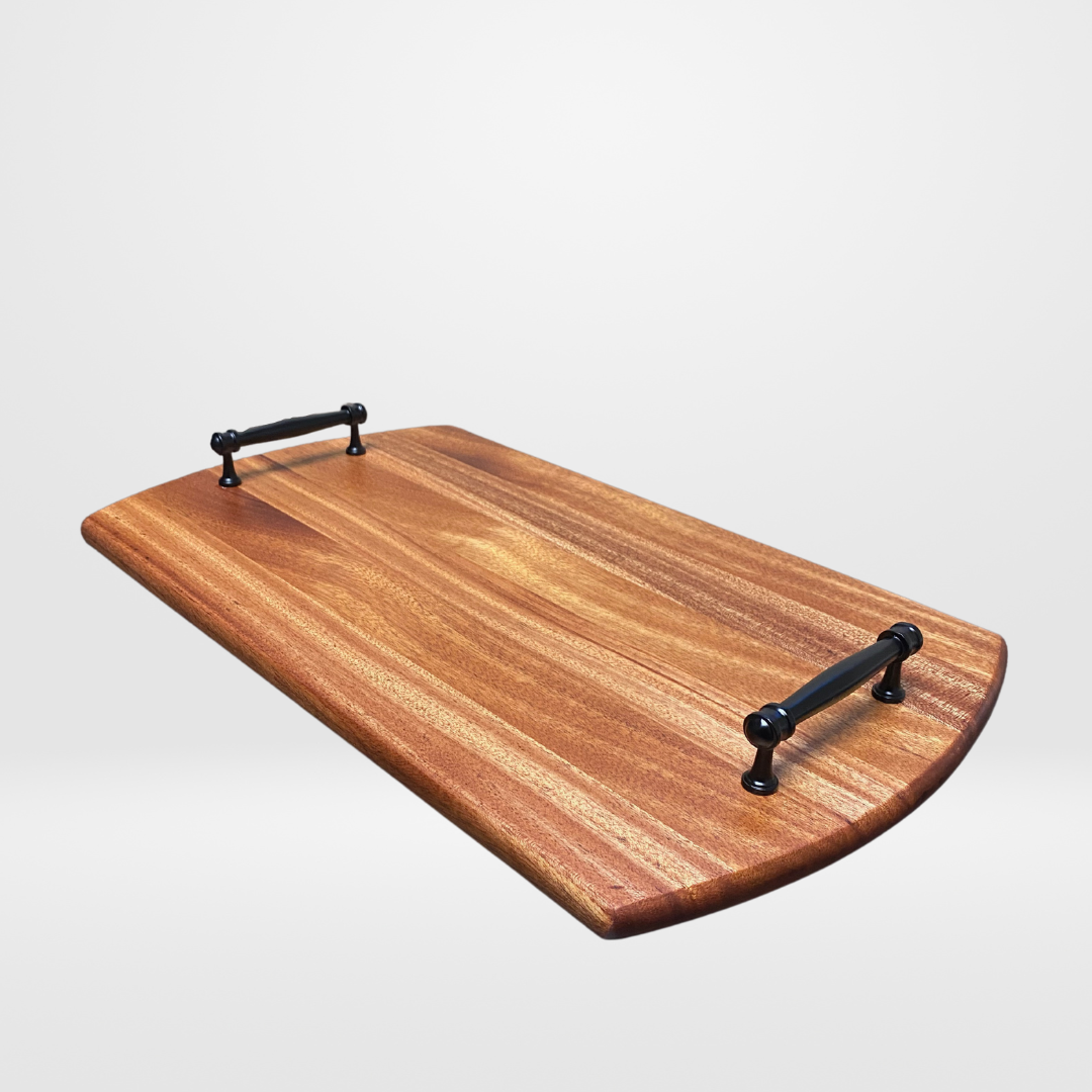 This hardwood charcuterie board is a handmade, face grained, board made with zero dyes or stains. It is made from ¾” thick Mahogany from Africa and comes with handles optional. This board would work great for charcuterie, food display, breakfast in bed, and so much more. It has a food safe finish that will ensure long usage. Occasional maintenance with cutting board or butcher block conditioners (oils, wax, butters, blends, etc.) are recommended. Washing and care instructions also included.