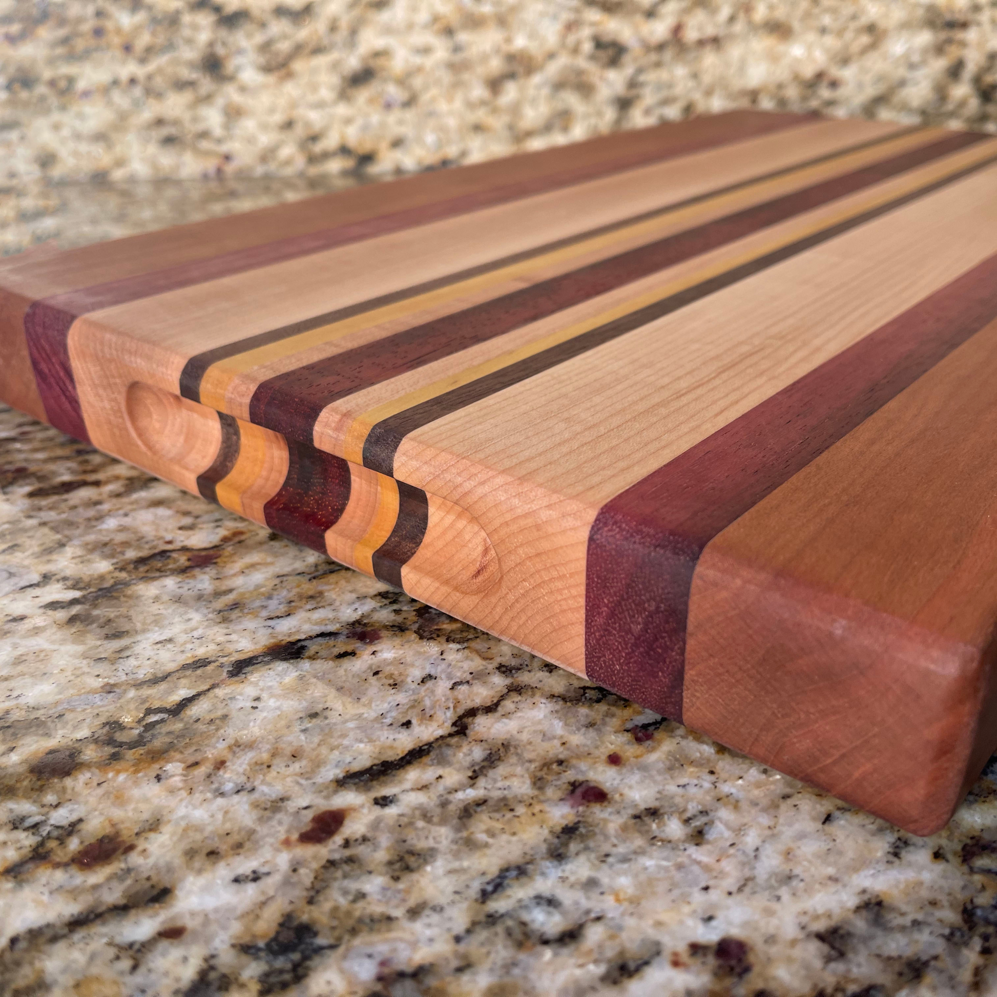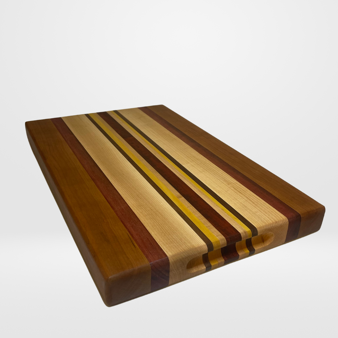 This is a handmade, edge grained cutting board with zero dyes or stains. This cutting board is part of our Passport Series. It is made from 1 ½” thick Cherry, Maple, Padauk, Purple Heart, Walnut, and Yellow Heart. This is a cutting board that is stunning enough to be used as a charcuterie board or for food display. The board comes standard with rounded edges and handles routed on both long ends. Both sides can be used as a cutting surface. It has a food safe finish that will ensure long usage. Occasional maintenance with cutting board or butcher block conditioners (oils, wax, butters, blends, etc.) are recommended. Our own blend of food safe conditioner is included with the purchase of the board. Washing and care instructions also included.