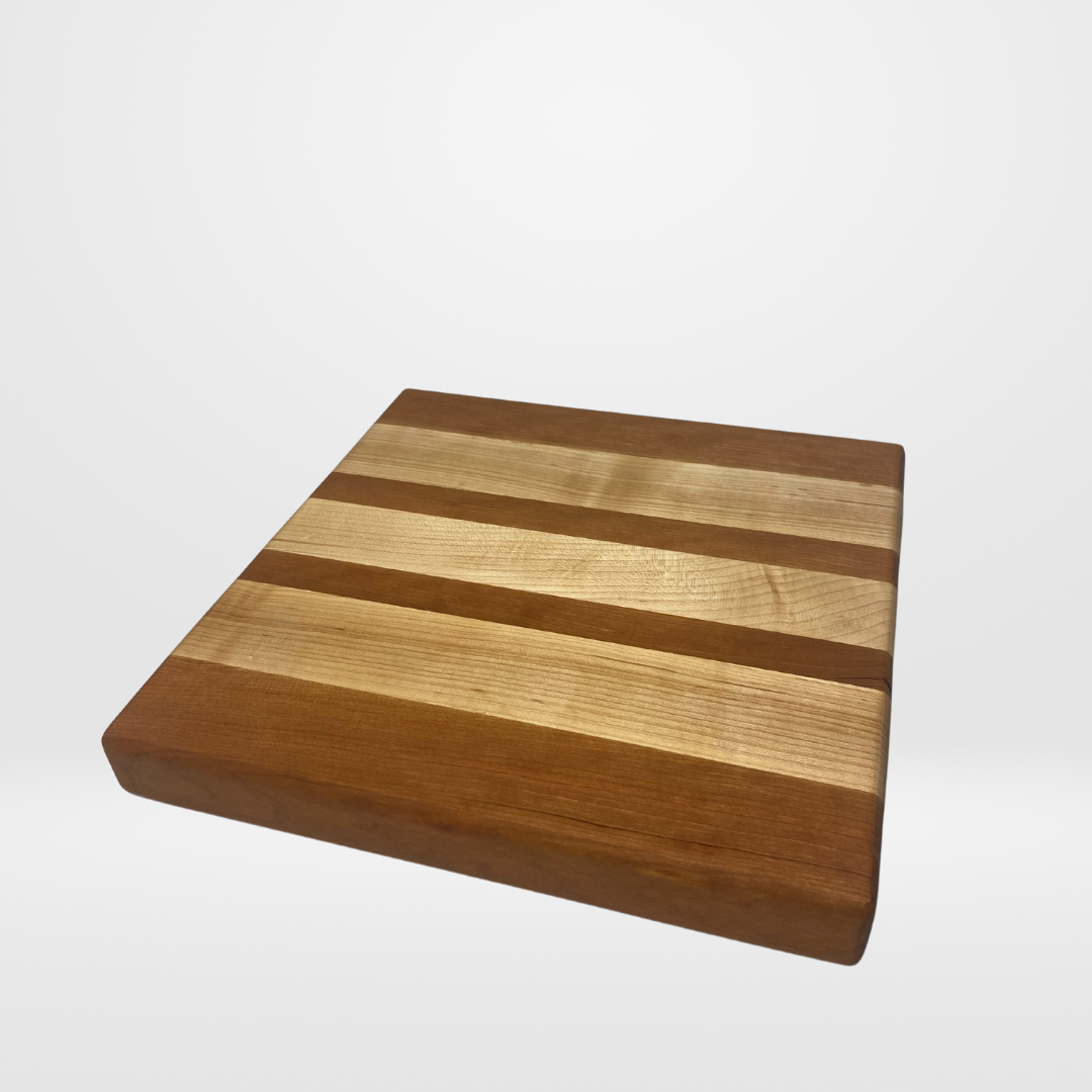 This is a handmade, edge grained cutting board with zero dyes or stains. This cutting board is part of our Passport Series. It is made from 1 ½” thick Cherry and Maple, both native to Pennsylvania and Ohio (or North America). This is a cutting board that can also be used as a charcuterie board or for food display. The board comes standard with rounded edges and handles routed on both long ends. Both sides can be used as a cutting surface. It has a food safe finish that will ensure long usage. Occasional maintenance with cutting board or butcher block conditioners (oils, wax, butters, blends, etc.) are recommended. Our own blend of food safe conditioner is included with the purchase of the board. Washing and care instructions also included.
