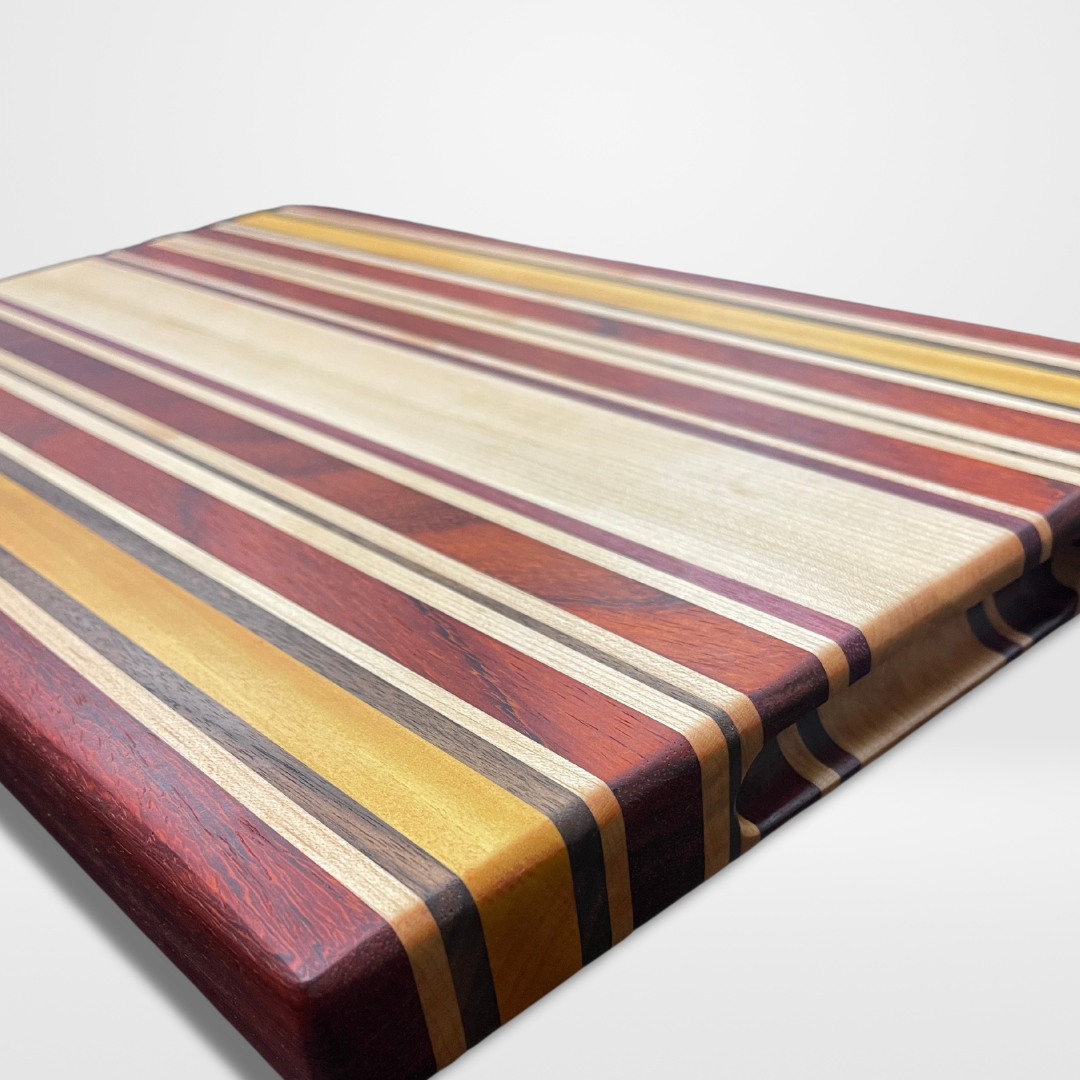 This is a handmade, edge grained cutting board with zero dyes or stains. This cutting board is part of our Passport Series. It is made from 1 ½” thick Maple, Padauk, Pau Amarillo, Purple Heart, and Walnut. This is a cutting board that is stunning enough to be used as a charcuterie board or for food display. The board comes standard with rounded edges and handles routed on both long ends. Both sides can be used as a cutting surface. It has a food safe finish that will ensure long usage. Occasional maintenance with cutting board or butcher block conditioners (oils, wax, butters, blends, etc.) are recommended. Our own blend of food safe conditioner is included with the purchase of the board. Washing and care instructions also included.